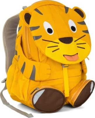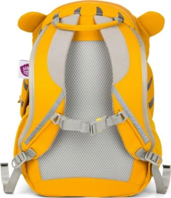 Affenzahn Kinder Rucksack für Kindergarten und Vorschule THEO TIGER; Maße: ca. 34 x 28 x 11 cm (HxBxT); RV-Hauptfach gepolstert mit 1 offenen Steckfach mit Gummizug; 1 Trageschlaufe; Reflektoren; 2 Schultergurte gepolstert/ verstellbar; Füße sind jew. 1 kleines RV-Fach; Kopf-Klappe mit feinem Riemchen zusammengesteckt – darunter: 1 offenes Netz-Steckfach in Gelb als Bauch; seitlich: je 1 offenes Netz-Steckfach mit Gummizug; zu 50% aus recycelten PET-Flaschen