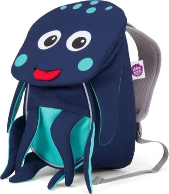 Oliver Octopus – so betitelt Affenzahn den niedlichen Kinder Rucksack in Blau mit herausziehbarer Zunge. Diese ist mit einem Namensschild in Sichthülle (auch für kleines Foto o.Ä.) versehen. Maße: ca. 30 x 23 x 10 cm (HxBxT); RV-Hauptfach mit gepolsterter Rückwand und 1 offenen Steckfach mit Gummizug; 1 Trageschlaufe; 2 Schultergurte gepolstert/ verstellbar mit Reflektoren